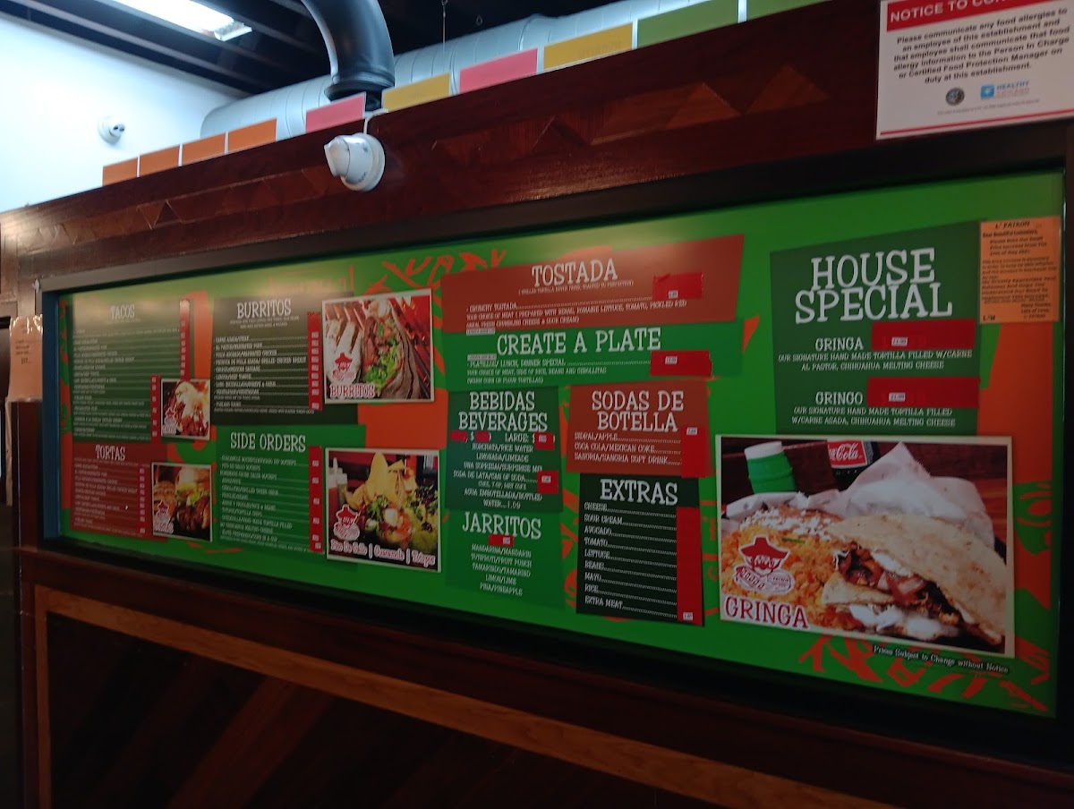 Marinated Pork- Refried Beans, Romaine Lettuce, Tomatoes, Sour Cream, Avocado.